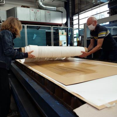 An zwei Tagen im LZH entstanden mehrere langformatige Papiere, die im Raum aufgehängt wie Skulpturen wirken und so vom Standort des Betrachters aus stetig neue Perspektiven eröffnen. Der Laser prägte dabei das Papier mit feinen Schmauchspuren und ermöglichte die Papierbearbeitung im Dreidimensionalen.